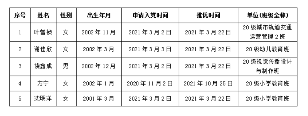 根据党员发展工作有关要求,经支委研究决定,确立叶曾桢等5位同学为入党积极分子。现将其有关情况予以公示。
